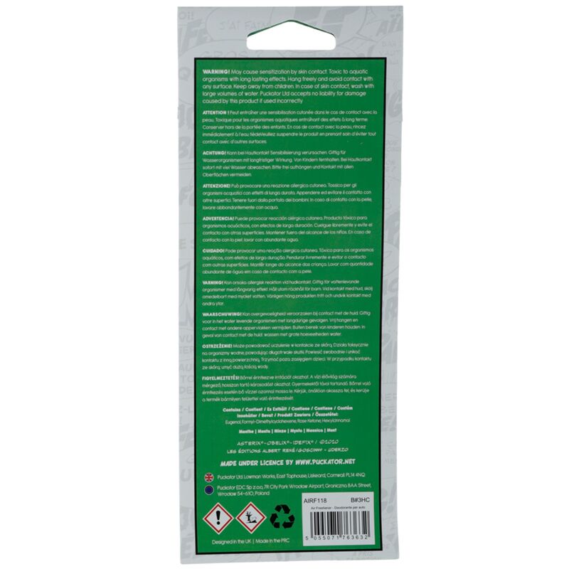 https://www.puckator.es/airf118-ambientador-de-coche-idefix-de-asterix-y-obelix-menta.htmlAIRF118Ambientador de Coche Idéfix de Astérix y Obélix Menta<p>Ambientador de Coche Idéfix de Astérix y Obélix Menta</p><ul><li><strong>Material:</strong> Cartón y Fragancia</li><li><strong>Ingredientes de la Fragancia:</strong> Disponible en el Envoltorio. </li><li><strong>Información de Seguridad:</strong> Mantener lejos del alcance de los niños. Para más información consultar el envoltorio.</li><li><strong>Información sobre la Licencia:</strong> Este producto cuenta con licencia completa y puede venderse en todo el mundo.</li></ul><p><strong>Información complementaria:</strong></p><ul><li><strong>¿Quieres saber más acerca de los métodos de trabajo de Puckator?</strong> Encuentra todo lo que necesitas saber en la <a href="/advice-centre" target="_blank" title="Puckator España - Guía de Compra">guía de compra del cliente.</a></li></ul></ul>https://www.puckator.es/media/catalog/product/A/I/AIRF118_001_1647272734.jpg0.58instock0.580.5800Puckator000https://www.puckator.es/media/catalog/product/A/I/AIRF118_001_1647272734.jpg158761660117193194091941019411/Ambientadores Para Coche/Internacionales/Regalos de Astérix y Obélix/Temporary Sale - FR2020-07-05T20:08:00+0000