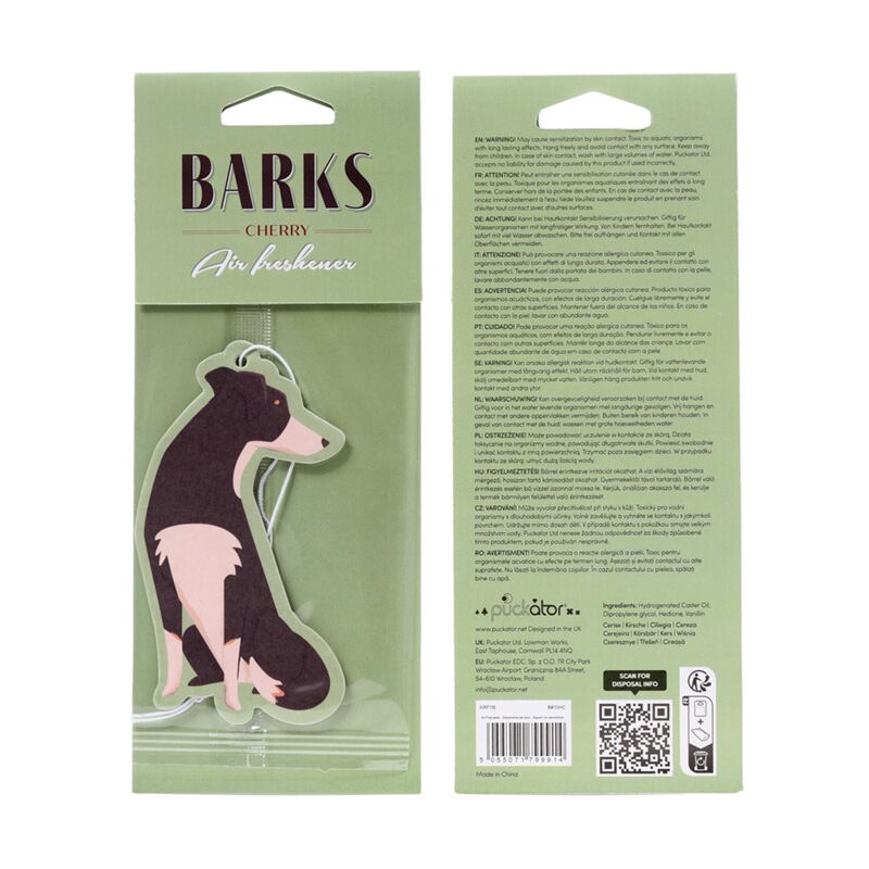 https://www.puckator.es/airf156-ambientador-de-coche-ladridos-de-perro-barks-perfume-cerezas.htmlAIRF156Ambientador de Coche Ladridos de Perro Barks Perfume Cerezas<p>Ambientador de Coche Ladridos de Perro Barks Perfume Cerezas</p><ul><li><strong>Material:</strong> Cartulina, Polipropileno, Elástico, Papel Absorbente, y Fragancia</li><li><strong>Fragancia:</strong> Cereza</li><li><strong>Información de Seguridad:</strong> Mantener lejos del alcance de los niños. Toda la información sobre seguridad y la fragancia figura en el envase del producto. No lo apoye sobre ninguna superficie, ya que los aceites del ambientador pueden mancharla o dañarla.</li></ul><p><strong>Información complementaria:</strong></p><ul><li><strong>¿Quieres saber más acerca de los métodos de trabajo de Puckator?</strong> Encuentra todo lo que necesitas saber en la <a href="/advice-centre" target="_blank" title="Puckator España - Guía de Compra">guía de compra del cliente.</a></li></ul></ul>https://www.puckator.es/media/catalog/product/A/I/AIRF156_001_1743672151.jpg0.54instock0.540.5400Puckator000https://www.puckator.es/media/catalog/product/A/I/AIRF156_001_1743672151.jpg158761660117193194091941019411/Ambientadores Para Coche/Perros/Vuelve a Stock2024-06-03T11:48:44+0000