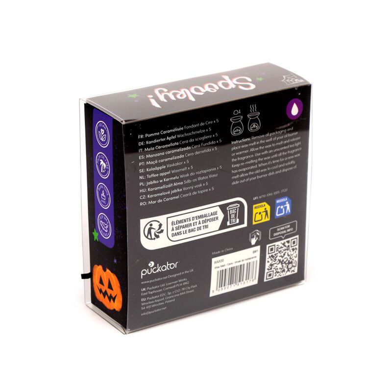 https://www.puckator.es/wax35-set-de-5-ceras-artesanales-espeluznante-halloween.htmlWAX35Set de 5 Ceras Artesanales Espeluznante Halloween<p>Set de 5 Ceras Artesanales Espeluznante Halloween</p><ul><li><strong>Material:</strong> Cera de Soja, Cera de Palma, Fragancia para Velas</li><li><strong>Unidades en el Set:</strong> 5</li><li><strong>Peso de Cada Cera Aromática:</strong> Aproximadamente TBCg</li><li><strong>Información de Seguridad:</strong> No deje el quemador de aceite sin supervisión. Manténgalo fuera del alcance de niños y mascotas y no añada agua a la cera derretida. Este producto no es comestible, no consumir. Si se ingiere, busque atención médica. Guárdelo alejado de la luz directa y siempre utilícelo en un quemador con un plato de tamaño adecuado para la cera derretida.</li><li><strong>Vegano:</strong> Sí</li><li><strong>Instrucciones:</strong> Las instrucciones completas y la información de seguridad se encuentran en el envase. Coloque una o dos ceras aromáticas en su quemador adecuado para llenar su hogar de fragancia. Para limpiarlo, espere a que la cera se enfríe y solidifique, luego empújela hacia afuera y deséchela en la basura.</li></ul><p><strong>Información complementaria:</strong></p><ul><li><strong>¿Quieres saber más acerca de los métodos de trabajo de Puckator?</strong> Encuentra todo lo que necesitas saber en la <a href="/advice-centre" target="_blank" title="Puckator España - Guía de Compra">guía de compra del cliente.</a></li></ul></ul><p><img src="{{media url="wysiwyg/Symbols/VEGAN.jpg";}}" alt="Vegan Packaging Symbol|Puckator" width="100" height="100"></p>https://www.puckator.es/media/catalog/product/W/A/WAX35_001_1760013678.jpg2.34instock2.342.3400Puckator000https://www.puckator.es/media/catalog/product/W/A/WAX35_001_1760013678.jpg10434162211622216234/Halloween/Cera Aromática2025-02-14T06:51:47+0000